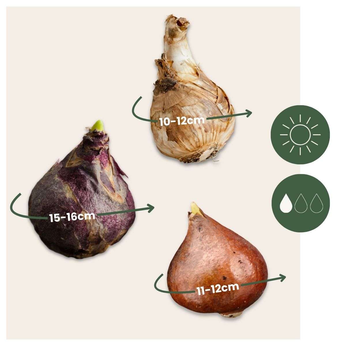 De bloembollen hebben een omtrek van ongeveer 10/12 cm bij levering.