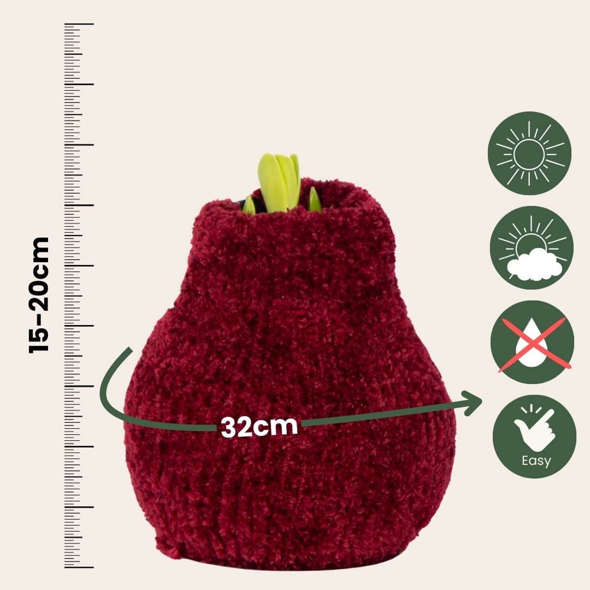 Breng de winterse sfeer in huis met Amaryllis! De prachtige en elegante rode bloemen stelen de show in je winterse interieur. De prachtige bloemen hebben een bloeitijd van 3 tot 6 weken. De bol is ongeveer 32cm in omtrek en wordt in een zacht teddy jasje geleverd.